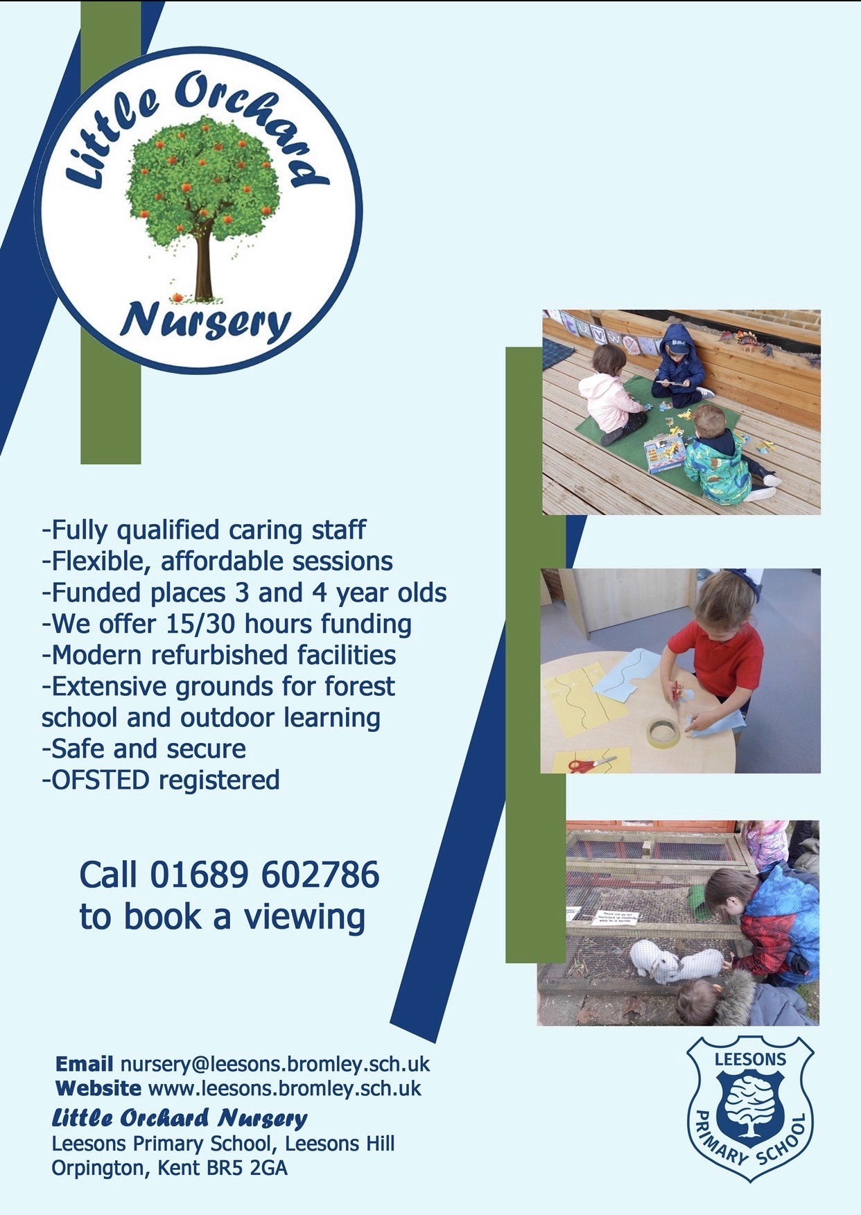 Please contact the school office if you would like more information, would like to arrange a visit to see the Nursery in action or would like to apply for a place. 01689 602 786