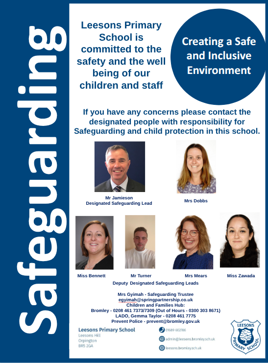All staff in school have safeguarding training annually. Some staff members have more in-depth training and lead on safeguarding in school. If you have any safeguarding concerns about children at Leesons you should contact: